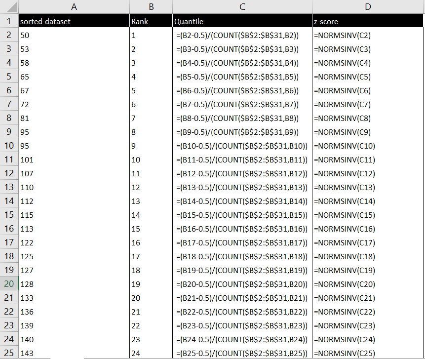 Q-Q图可以用于检验样本是否服从正态分布,在Excel里绘制Q-Q图步骤如下(参考How do you make Q-Q plot in Excel?):