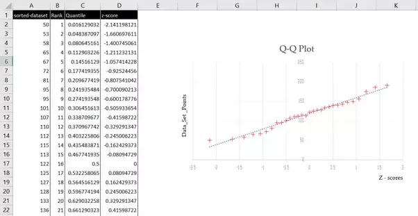 Then, you Insert a scatter plot, using the z-scores as the X axis and the data set points as the Y Axis