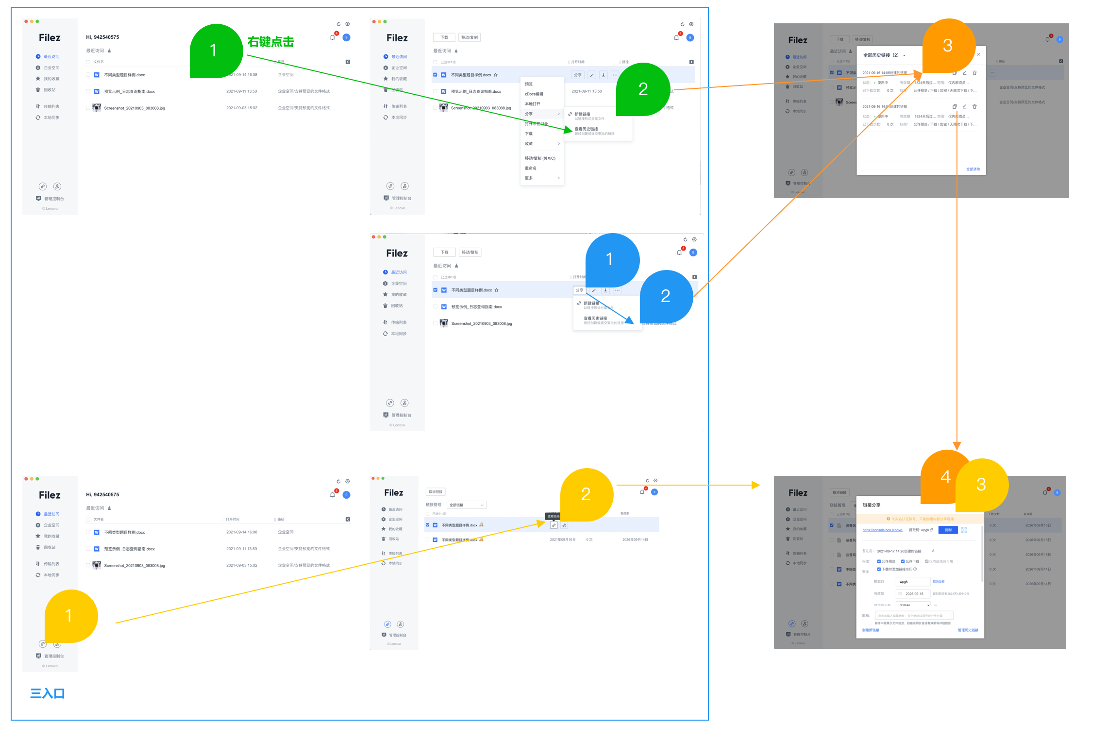 两者与黄色方案的区别在于:不同的目的。其中一个是查看【某个文件】的分享历史,另一个是查看所有文件的所有链接【所有链接】。