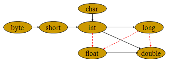 - 强制类型转换:从大到小,可能会损失精度;例如int a=97;char c=a;