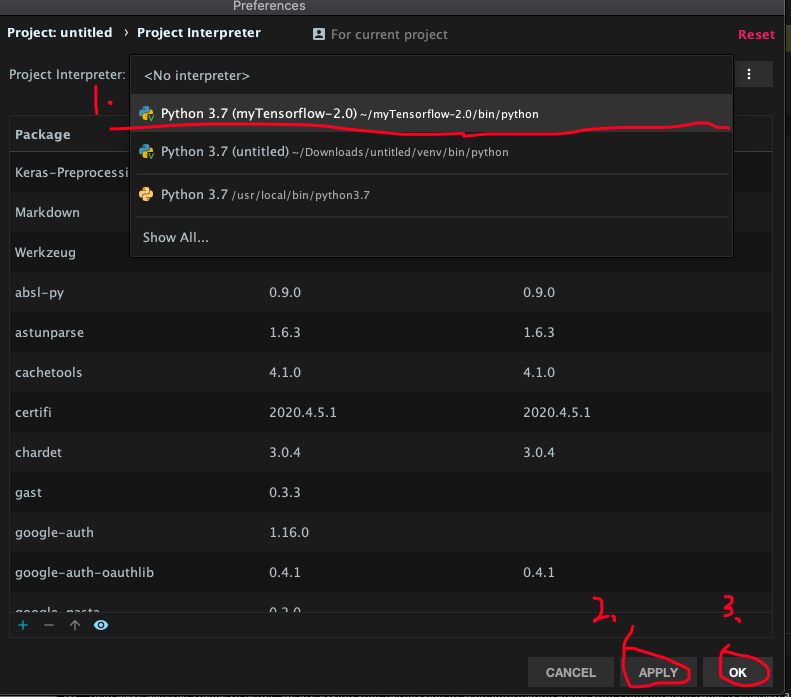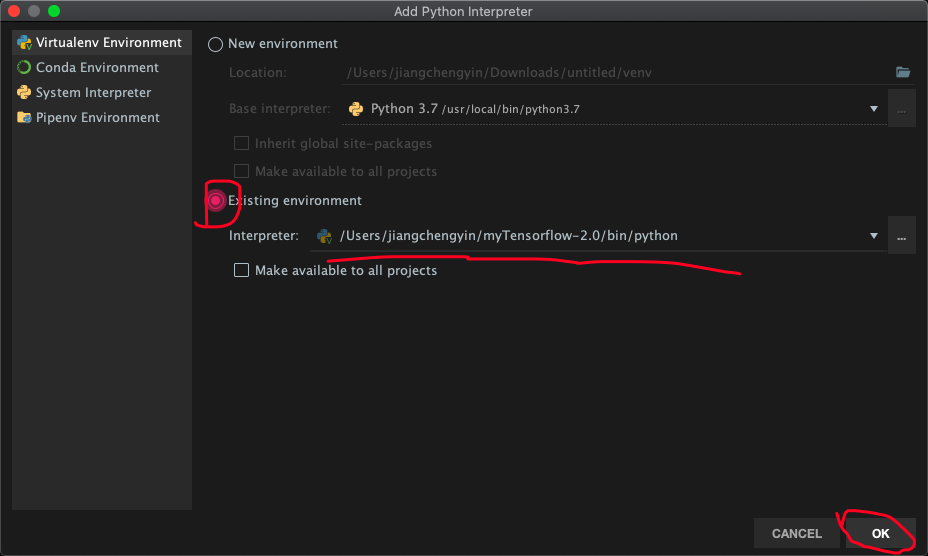 可能在Existing environment中没有自动出现虚拟环境,但是我们可以自己收到找到它。参照给出的图片案例,只要修改一下虚拟环境的名字[myTensorflwo-2.0],就可以找到另外一个虚拟环境了。