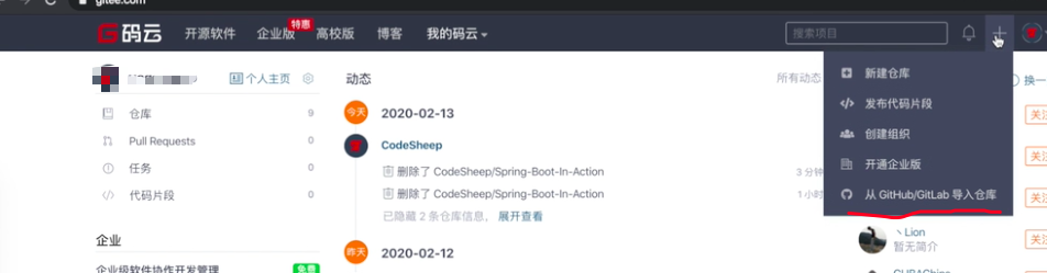2.打开 码云 网站,注册好账号后点击从Github中导入仓库