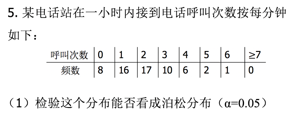 1 #(1)H0:分布满足泊松分布 H1:分布不满足泊松分布 2 x=0:4 3 y=c(8,16,17,10,9) 4 real_pois=ppois(x,mean(rep(x,y)))#生成满足泊松分布的数组,与data相比 5 n=length(y) 6 p=numeric(n) 7 p[1]=real_pois[1] 8 p[n]=1-real_pois[n-1] 9 for (i in 2:(n-1)) { 10 p[i]=real_pois[i]-real_pois[i-1]#ppois生成的是F(x),为得到每个点的概率,用相减 11 } 12 chisq.test(y,p=p)#y是data的p, p是若满足泊松应符合的p 13 #p-value=0.9891>0.05 故接受原假设,即该分布满足泊松分布