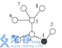 在一个地区中有 n 个村庄,编号为 1, 2, ..., n。有 n – 1 条道路连接着这些村 庄,每条道路刚好连接两个村庄,从任何一个村庄,都可以通过这些道路到达其 他任一个村庄。每条道路的长度均为 1 个单位。 为保证该地区的安全,巡警车每天要到所有的道路上巡逻。警察局设在编号 为 1 的村庄里,每天巡警车总是从警察局出发,最终又回到警察局。 下图表示一个有 8 个村庄的地区,其中村庄用圆表示(其中村庄 1 用黑色的 圆表示),道路是连接这些圆的线段。为了遍历所有的道路,巡警车需要走的距 离为 14 个单位,每条道路都需要经过两次。