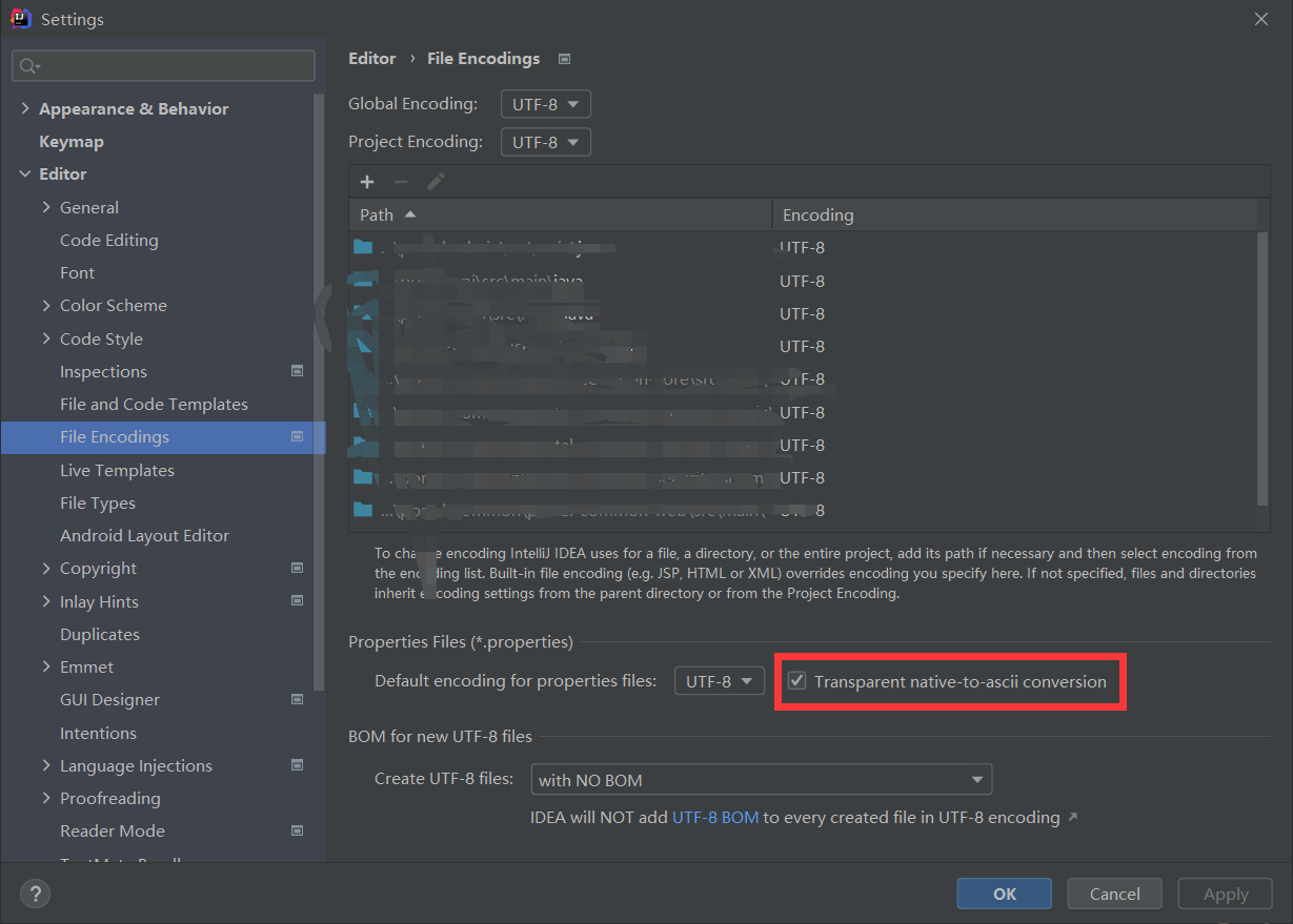 idea 选择File 选择Setings 搜索框搜索 file encodings 勾选 Transparent native-to-ascii conversion