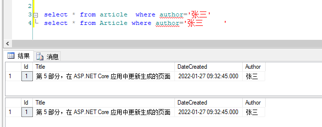 使用如下两条select 语句查询都可以查询出作者是张三的数据:
