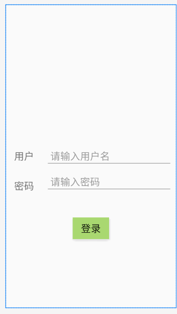 <?xml version="1.0" encoding="utf-8"?> <RelativeLayout xmlns:android="http://schemas.android.com/apk/res/android" xmlns:app="http://schemas.android.com/apk/res-auto" xmlns:tools="http://schemas.android.com/tools" android:layout_width="match_parent" android:layout_height="match_parent" tools:context=".MainActivity" android:orientation="vertical"> <TextView android:id="@+id/tv_1" android:layout_width="wrap_content" android:layout_height="wrap_content" android:layout_centerVertical="true" android:text="用户" android:textSize="24sp" android:layout_margin="10dp" android:padding="10dp"/> <TextView android:id="@+id/tv_2" android:layout_width="wrap_content" android:layout_height="wrap_content" android:layout_centerVertical="true" android:text="密码" android:textSize="24sp" android:layout_margin="10dp" android:padding="10dp" android:layout_below="@id/tv_1"/> <EditText android:id="@+id/et_1" android:layout_width="match_parent" android:layout_height="wrap_content" android:layout_centerVertical="true" android:hint="请输入用户名" android:textColor="#000000" android:textSize="24sp" android:layout_margin="10dp" android:padding="10dp" android:layout_toRightOf="@id/tv_1" android:drawablePadding="10dp"/> <EditText android:id="@+id/et_2" android:layout_width="match_parent" android:layout_height="wrap_content" android:layout_below="@id/tv_1" android:layout_centerVertical="true" android:hint="请输入密码" android:textColor="#000000" android:textSize="24sp" android:layout_marginLeft="10dp" android:layout_marginRight="10dp" android:padding="10dp" android:layout_toRightOf="@id/tv_2" android:drawablePadding="10dp" android:inputType="textPassword"/> <Button android:layout_width="wrap_content" android:layout_height="wrap_content" android:layout_below="@id/et_2" android:layout_centerHorizontal="true" android:layout_margin="60dp" android:padding="10dp" android:text="登录" android:textSize="24sp" android:background="#A9D870"/> <ImageView android:layout_width="70dp" android:layout_height="70dp" android:layout_above="@id/et_1" android:layout_centerInParent="true" android:layout_marginBottom="60dp" </RelativeLayout>