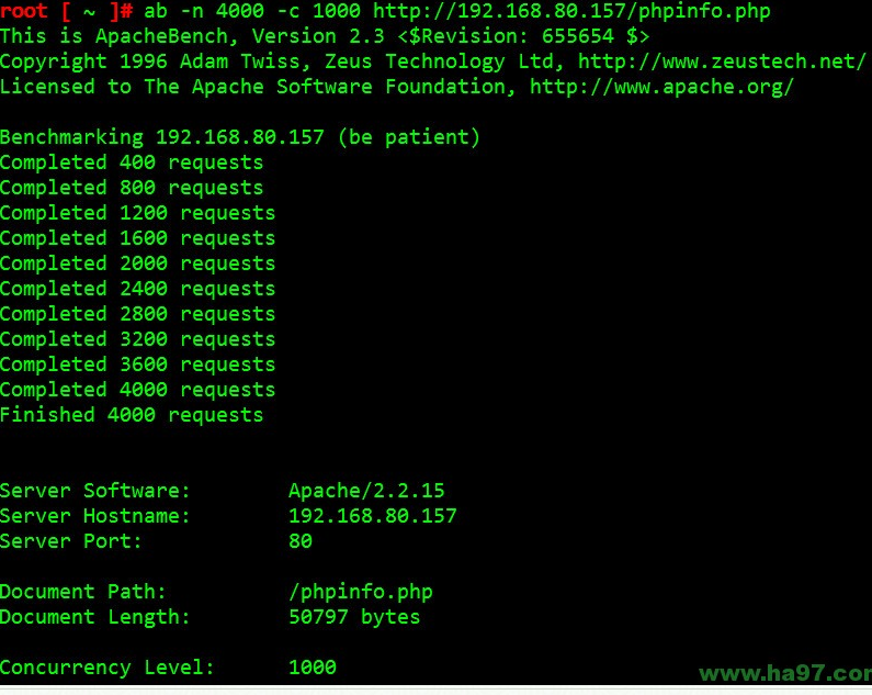 在Linux系统,一般安装好Apache后可以直接执行;# ab -n 4000 -c 1000 http://www.ha97.com/