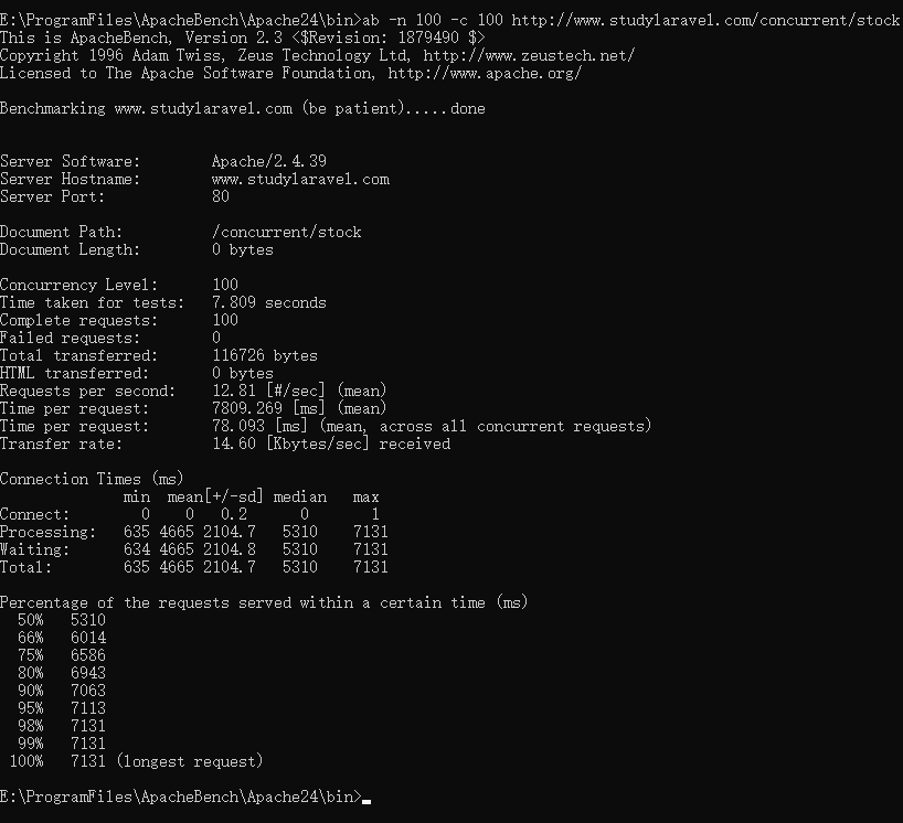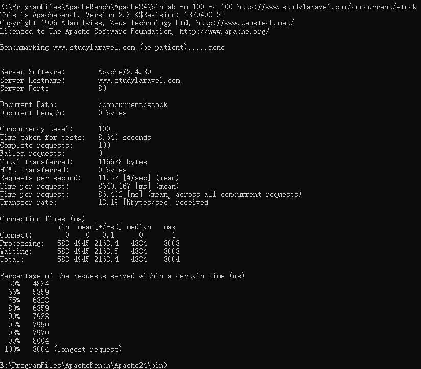 ab -n 100 -c 100 http://www.studylaravel.com/concurrent/stock
