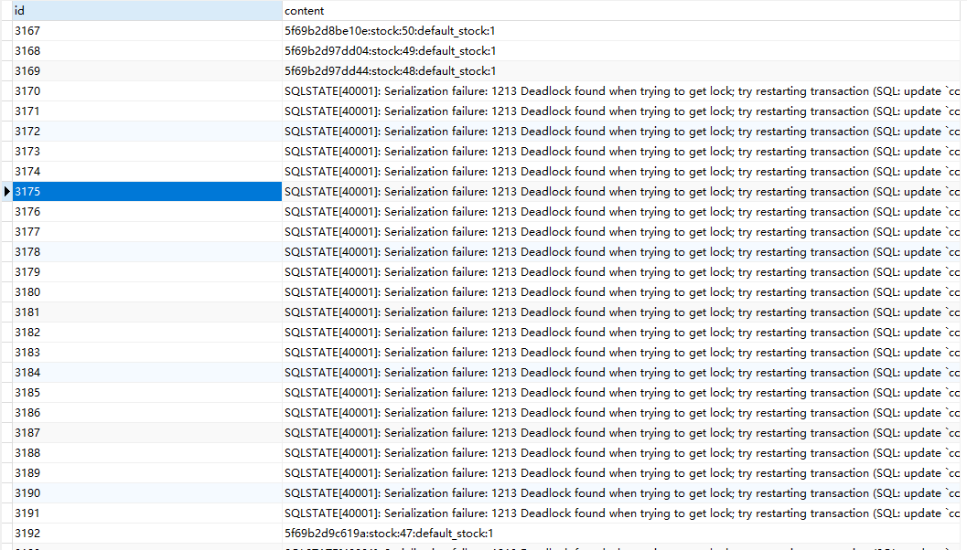 SQLSTATE[40001]: Serialization failure: 1213 Deadlock found when trying to get lock; try restarting transaction (SQL: update `concurrent` set `name` = 5f69b2d9c1d2b, `version` = version+1, `stock` = stock-1)