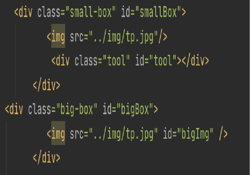 1.首先,添加盒子:定义图片盒子small-box, 黄色移动盒子tool, 放大盒子big-box