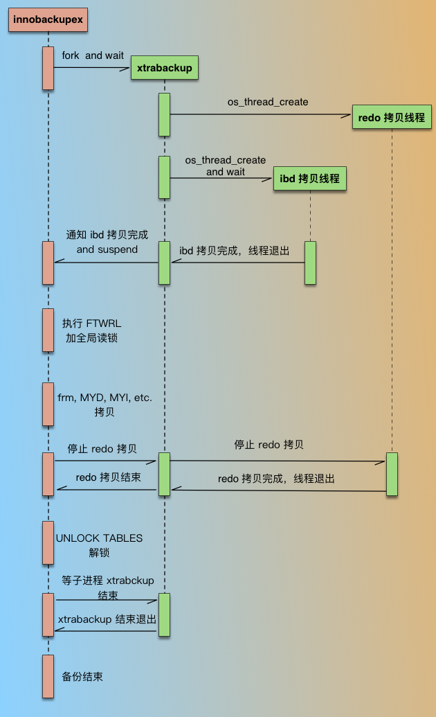 然后再启动 ibd 数据拷贝线程,在 xtrabackup 拷贝 ibd 过程中,innobackupex 进程一直处于等待状态(等待文件被创建)。 3.xtrabackup 拷贝完成idb后,通知 innobackupex(通过创建文件),同时自己进入等待(redo 线程仍然继续拷贝); 4.innobackupex 收到 xtrabackup 通知后,执行FLUSH TABLES WITH READ LOCK (FTWRL),取得一致性位点,然后开始备份非 InnoDB 文件(包括 frm、MYD、MYI、CSV、opt、par等)。