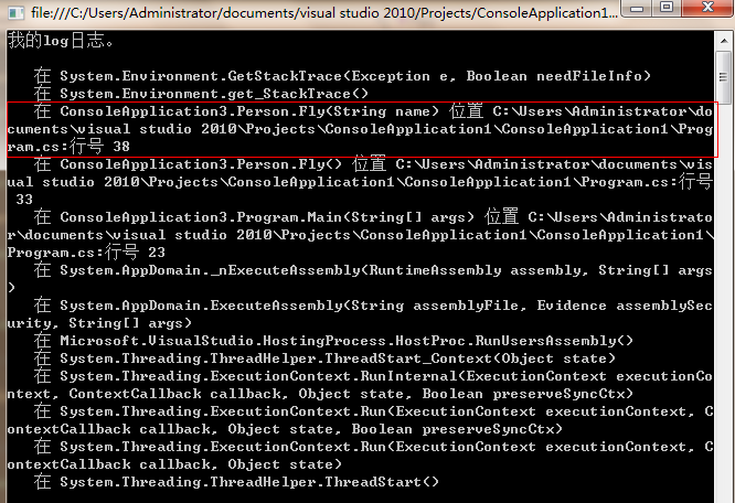 class Program { static void Main(string[] args) { Person person = new Person(); person.Fly(); Console.Read(); } } class Person { public void Fly() { Fly("test"); } public void Fly(string name) { Console.WriteLine("我的log日志。\n\n{0}", Environment.StackTrace); } }