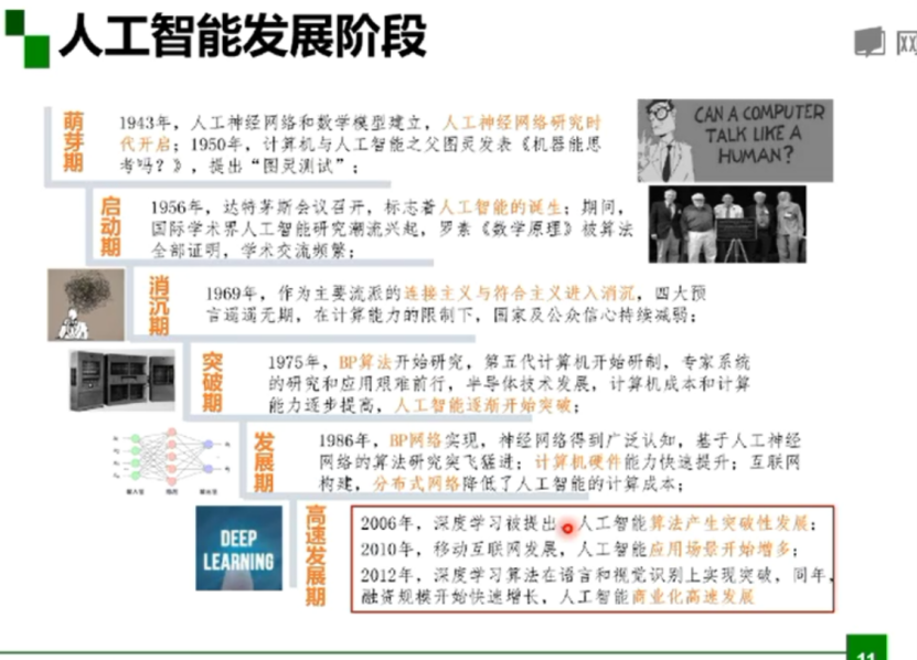 人工智能的发展阶段:萌芽期、启动期、消沉期、突破期、发展期、高速发展期。