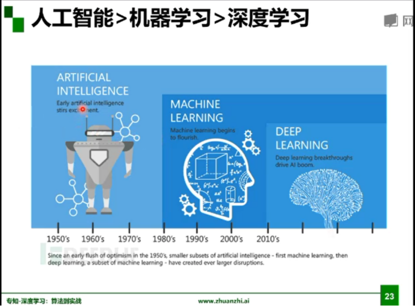 人工智能是一个领域,就是一个目标,我们希望机器人像人一样的去感知、去思考,机器学习的是来实现这样一个目标的,而深度学习是其中很小的一个点。