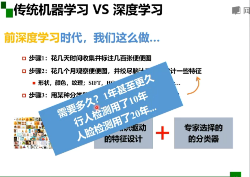 前深度学习时代,首先花几天时间收集并标注图像,然后花几个月观察图像,设计一些特征,最后使用某种分类器进行分类;
