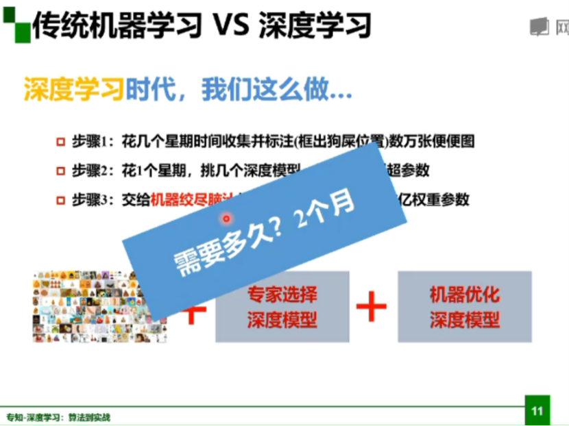 深度学习时代,首先花几个星期收集并标注图像,然后挑几个深度模型,选几组模型超参数,最后让机器优化模型;