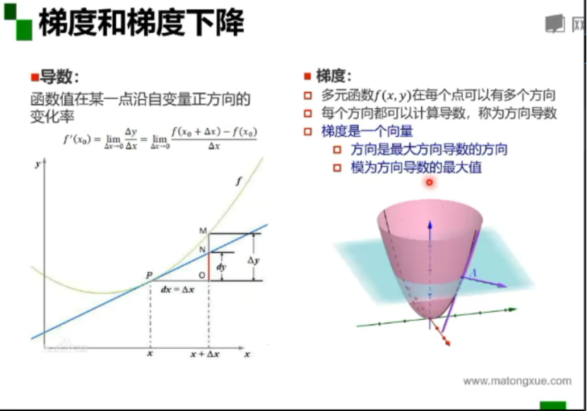 梯度:是一个向量,方向是最大方向导数的方向,模为方向导数的最大值。