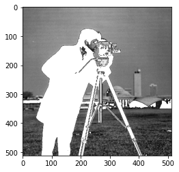 # Set to "white" (255) pixels where mask is True camera = data.camera() mask = camera < 80 camera[mask] = 255 plt.imshow(camera, 'gray')