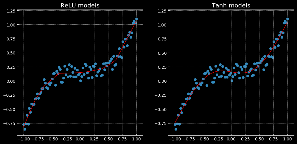以上表现了一个无法用线性回归完成,但可以用这个相同的网络解决的问题。左面使用了Relu函数,有图使用了tanh函数,前者是一个分段的线性函数,后者则是连续、平滑的回归。
