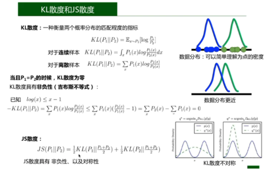 KL散度:一种衡量两个概率分布的匹配程度的指标。当P1=P2时,KL为零;KL散度具有非负性;具有不对称性。由于不对称性所以会导致对P1||P2还是对P2||P1结果不同,所以产生了JS散度,具有非负性和对称性。