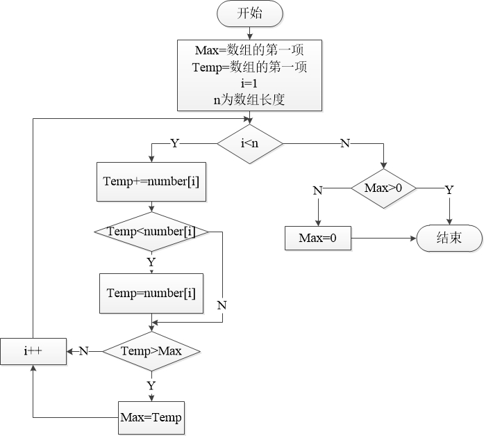 ###2.1分析 根据题目的背景,获得已经条件:1<=i<=j<=n,所以该序列不可能为空。题目的要求是求出某一个子段的最大值,所以设置两个变量Max,temp。max作为最优值,Max的初值为第一个整数;temp作为中间变量值。另temp=数组的第一个整数,在数组长度的范围内,加上数组的下一个整数number[i]。若相加之和大于number[i],则说明number[i-1]为正数,temp+=number[i];若小于number[i],则说明number[i-1]为负数,temp=number[i]。如果temp>Max时,则Max=temp;否则Max的值不变,temp继续向下试探。重复上述过程,直至达到数组长度。最后Max在与0进行比较,若小于0则Max=0。 ###2.2流程图 函数流程图如图2所示。