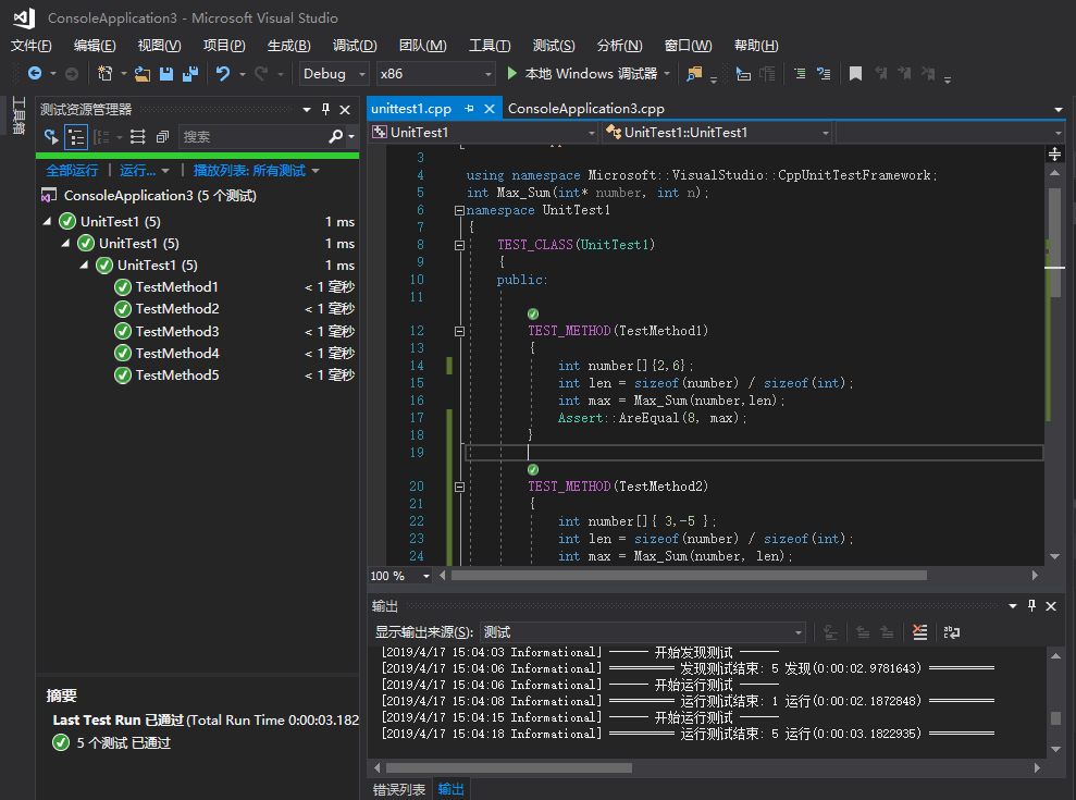 ###4.2测试样例设计 测试样例1:满足条件组合A。number{2,6}; 期望结果为8。 测试样例2:满足条件组合C。number{3,-5}; 期望结果为3。 测试样例3:满足条件组合E。number{-2,11}; 期望结果为11。 测试样例4:满足条件组合F。number{-6,-1}; 期望结果为0。 测试样例5:满足条件组合H。number{-2,-11}; 期望结果为0。 ###4.3测试代码 测试样例的代码如下 ```cpp TEST_METHOD(TestMethod1) { int number[]{2,6}; int len = sizeof(number) / sizeof(int); int max = Max_Sum(number,len); Assert::AreEqual(8, max); } TEST_METHOD(TestMethod2)