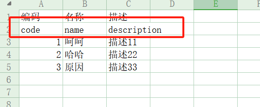 2.新建Excel导入模板,模板第2行为类中的字段名称,一一对应