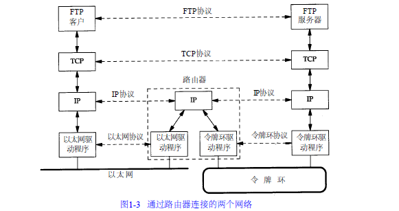 一个互连网(internet)就是一组通过相同协议族互连在一起的网络。构建互连网最简单的方法就是把两个或多个网络通过路由器进行连接。它是一种特殊的用于网络互连的硬件盒。路由器(Router)的好处是为为不同类型的物理网络提供连接:以太网、令牌环网、点对点的链接和FDDI(光纤分布式数据接口)。从历史上说,这些盒子称为网关。但现在网关这个术语只用来表示应用层网关:一个连接两种不同协议族的进程,它为特定的应用程序服务。
