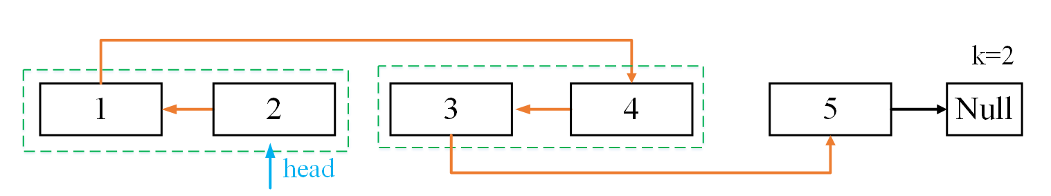 假如链表如下图所示,给定的k=2。链表中每两个节点一组进行翻转。即对每一组内的k个节点进行反转(1与2进行反转,3与4进行反转),之后将每组内反转好的节点连接起来。