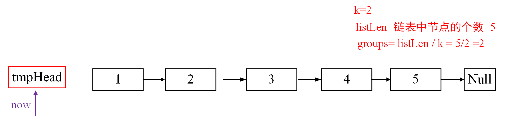 tmpHead为临时虚拟头节点,now指针变量的作用:衔接 每组翻转之后的链表。