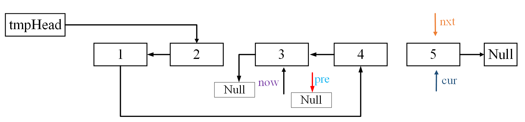now.next = pre; //如果i==0时(第一次翻转),tmpHead、now为同一个节点
