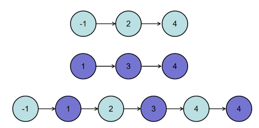 或输入{-1,2,4},{1,3,4}时,合并后的链表为{-1,1,2,3,4,4},所以对应的输出为{-1,1,2,3,4,4},转换过程如下图所示: