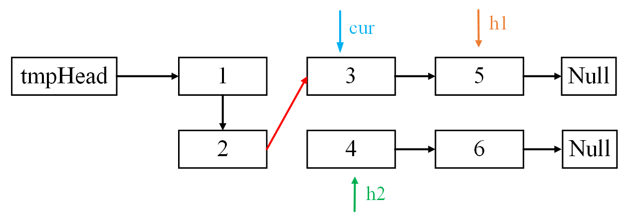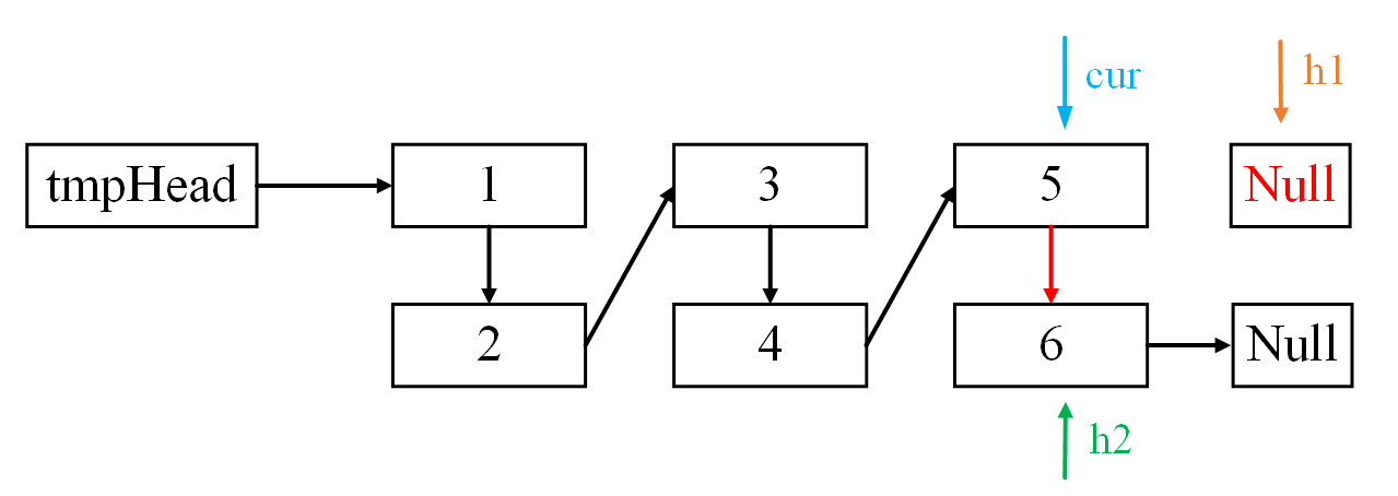由于h1已经指向Null了,这时只需要将cur指向h2就可以,如下图所示: