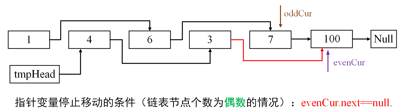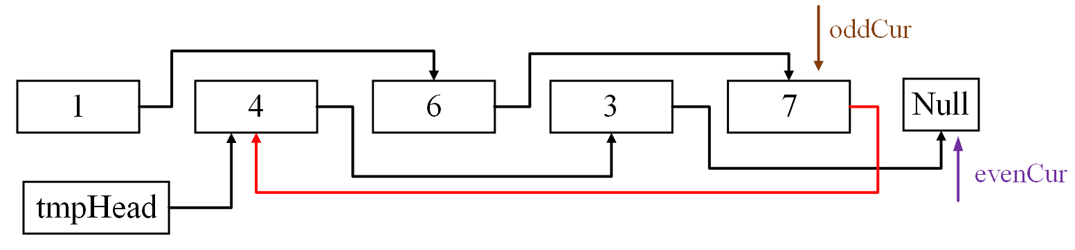 分别定义奇数节点操作指针变量oddCur和偶数节点操作指针变量evenCur,以及虚拟头节点tmpHead。变量指向如下图所示: