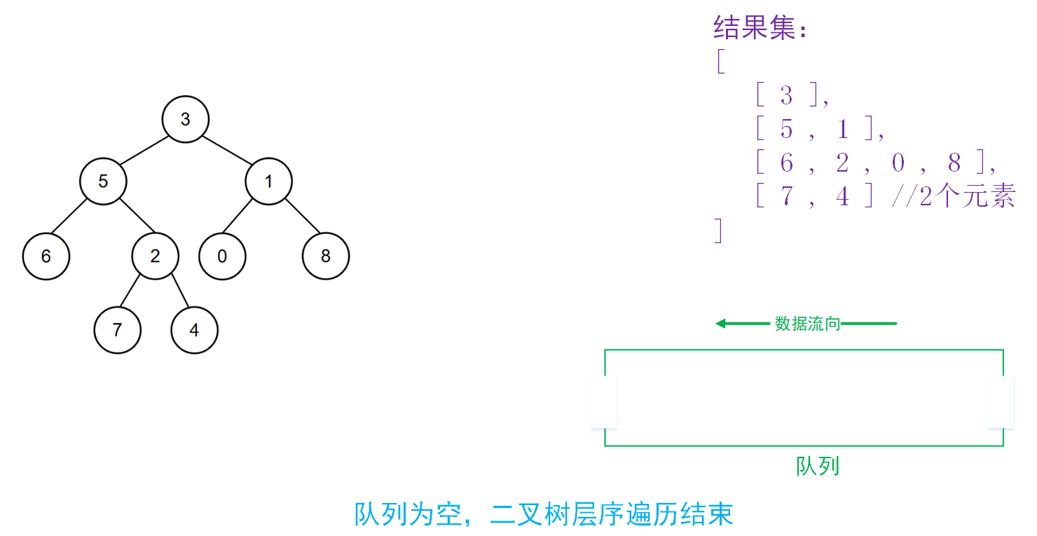 到此时,队列为空,二叉树的层序遍历完成。将结果集返回。