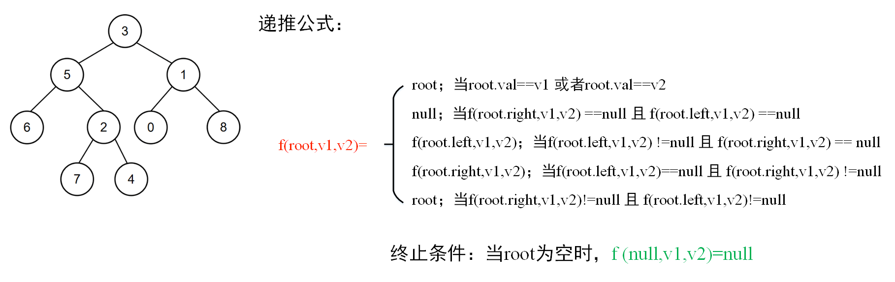 情况1:节点的值等于给定的值(满足给定的值p或q之一即可),该节点就是最近公共祖先