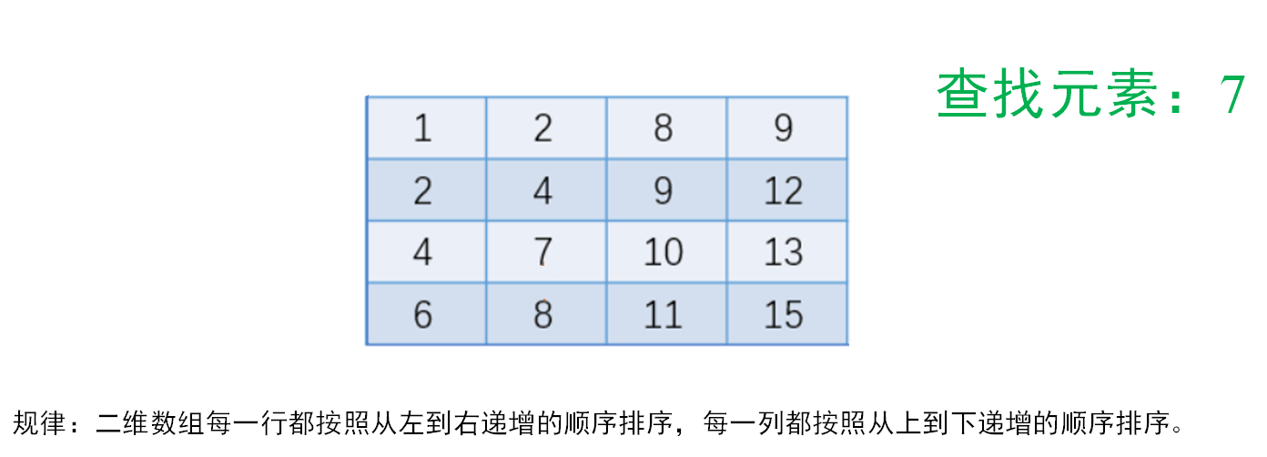 根据题目的描述,二维数组中的元素有规律:一行都按照从左到右递增的顺序排序,每一列都按照从上到下递增的顺序排序。