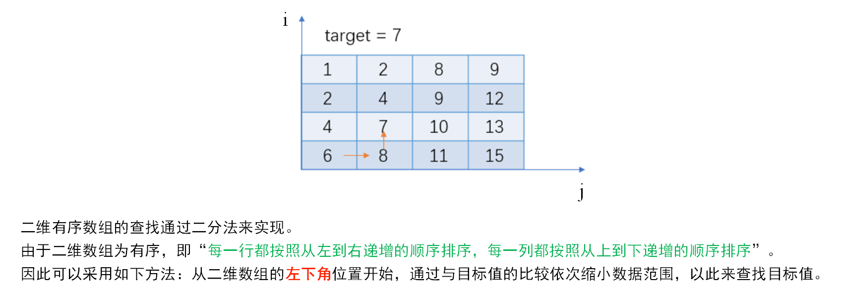 从二维数组的左下角位置开始比较,如果比较值(数组元素)等于 目标值,找到,直接返回;如果比较值数组元素) 小于 目标值,向右移动;比较值数组元素) 大于 目标值,向上移动。