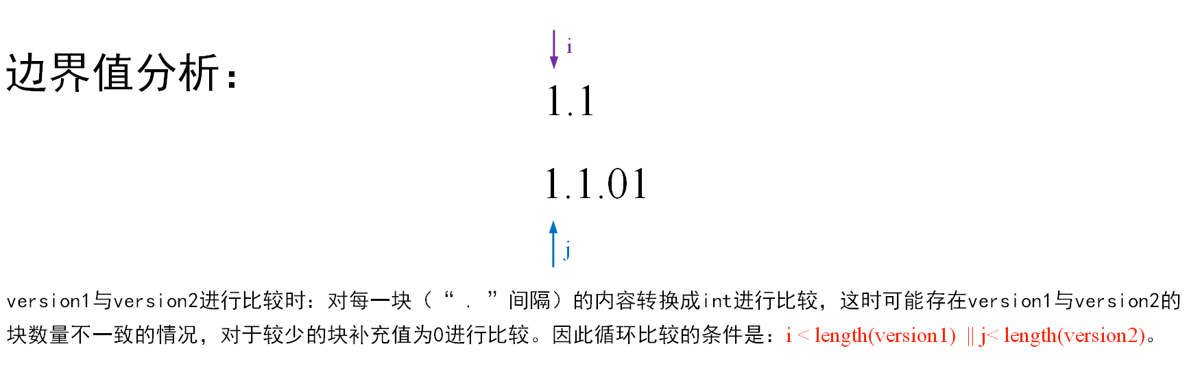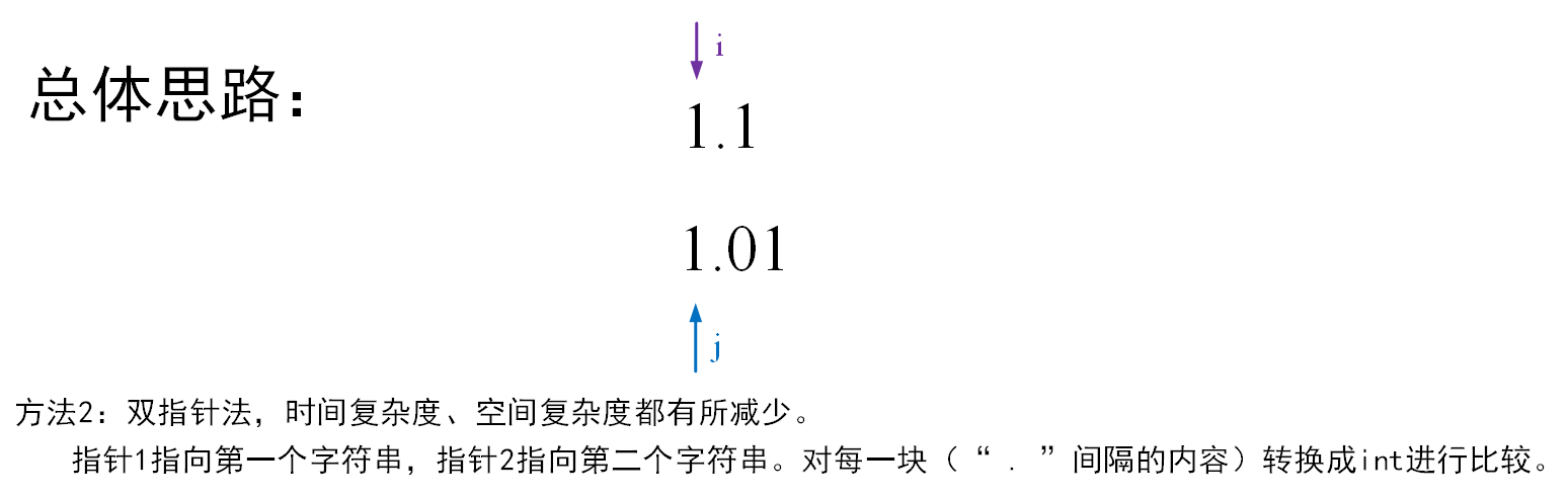 版本号的比较通过双指针法来完成。指针1指向第一个字符串,指针2指向第二个字符串。对每一块(“ . ”间隔)的内容转换成int进行比较。