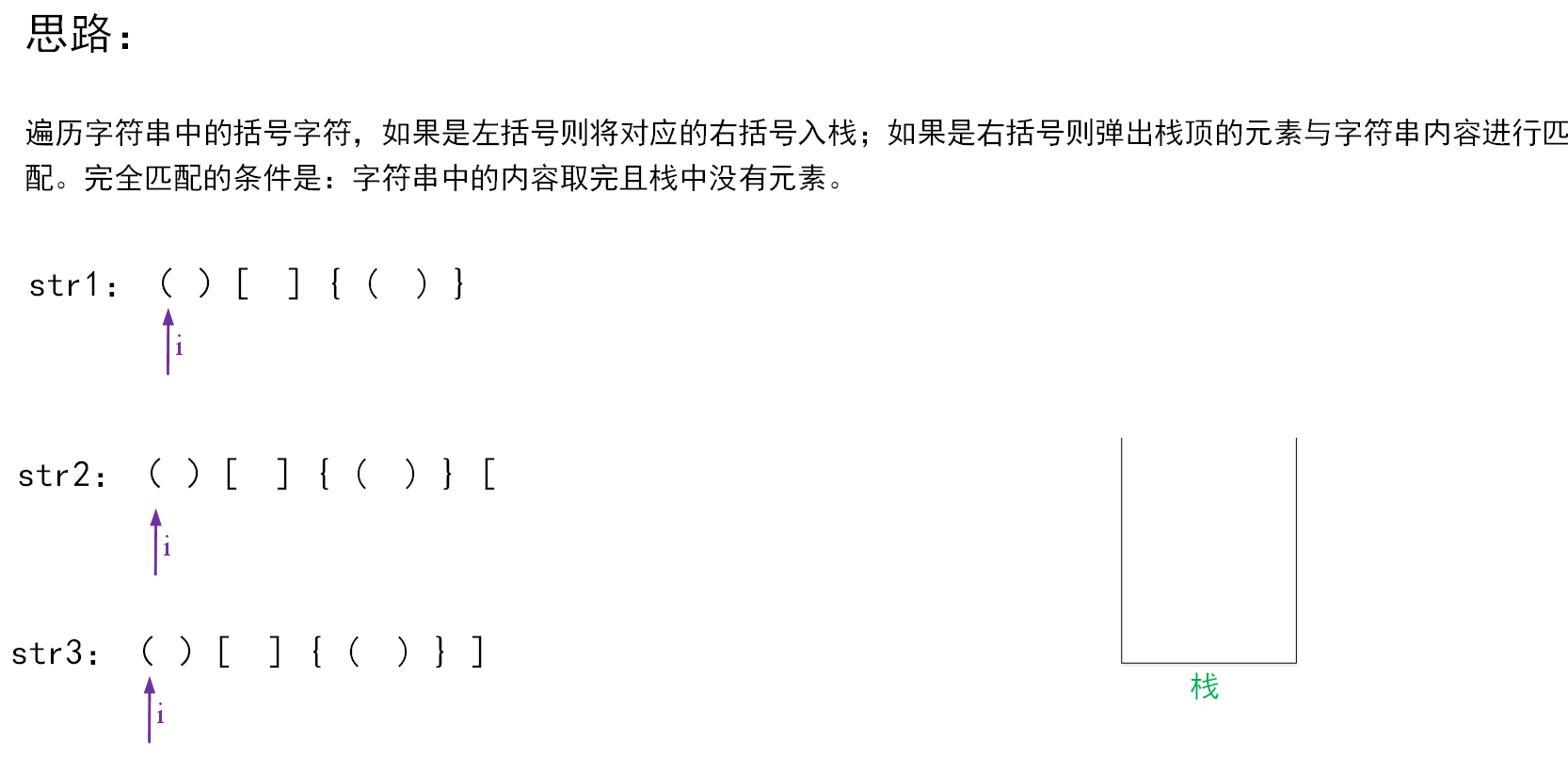 // 4. 所有字符串匹配完,且栈中没有元素,则说明括号匹配