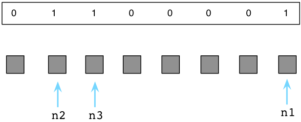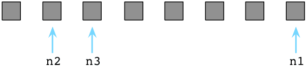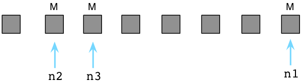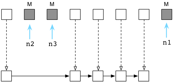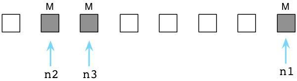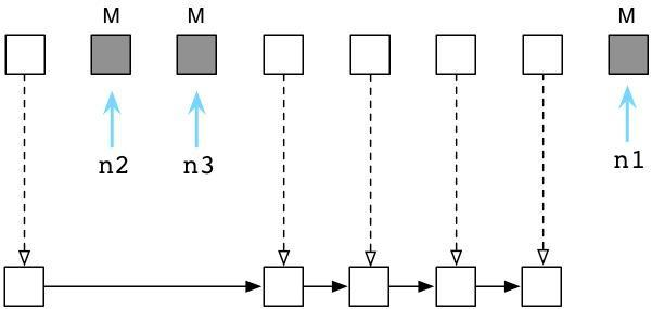 从这张图上我们可以看到有三个活跃的对象,因为指针n1、n2、n3仍然指向着它们。剩下的用白色矩形表示的对象即是垃圾。(当然,实际情况会复杂得多,自由链可能会包含上千个对象,并且有复杂的引用指向关系,这里的简图只是帮助我们了解Ruby的GC机制背后的简单原理,而不会将我们陷入细节之中)