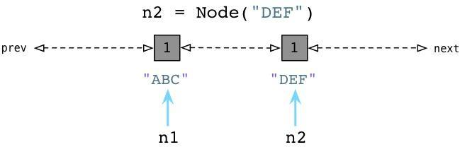 我们有一个构造器(在Python中叫做 init ),在一个实例变量中存储一个单独的属性。在类定义之后我们创建两个节点,ABC以及DEF,在图中为左边的矩形框。两个节点的引用计数都被初始化为1,因为各有两个引用指向各个节点(n1和n2)。