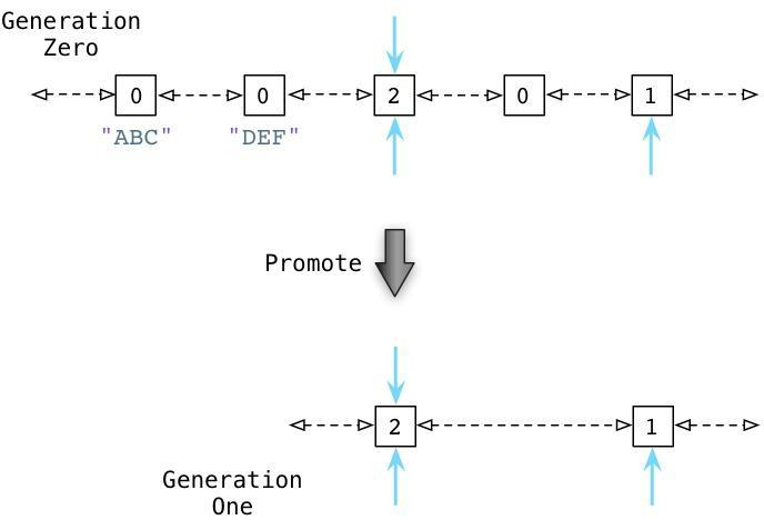 通过识别内部引用,Python能够减少许多零代链表对象的引用计数。在上图的第一行中你能够看见ABC和DEF的引用计数已经变为零了,这意味着收集器可以释放它们并回收内存空间了。剩下的活跃的对象则被移动到一个新的链表:一代链表。