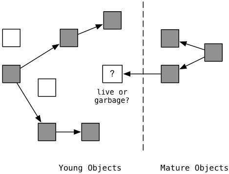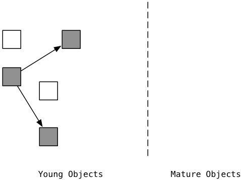 这个算法的一个重要挑战是值得深入解释的:假定你的代码创建了一个新的年轻的对象,并且将其作为一个已存在的成熟对象的子嗣加入。举个例子,这种情况将会发生在,当你往一个已经存在了很长时间的数组中增加了一个新值的时候: