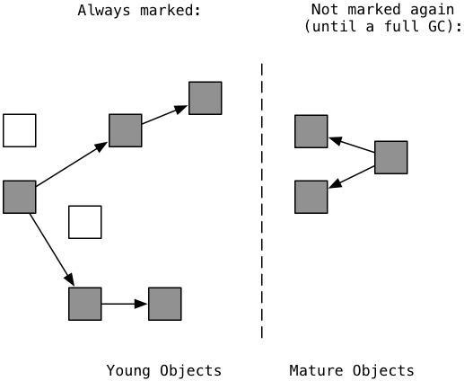 如同Python那样,Ruby的垃圾收集器将大部分精力都放在新一代的对象之上。它仅仅会将自上一次GC过程发生后创建的新的、年轻的对象包含在接下来的标记清除过程中。这是因为很多新对象很可能马上就会变成垃圾(白色标记)。Ruby不会重复标记右边的成熟对象。因为他们已经在一次GC过程中存活下来了,在相当长的一段时间内不会很快变成垃圾。因为只需要标记新对象,所以Ruby 的GC能够运行得更快。它完全跳过了成熟对象,减少了代码等待GC完成的时间。
