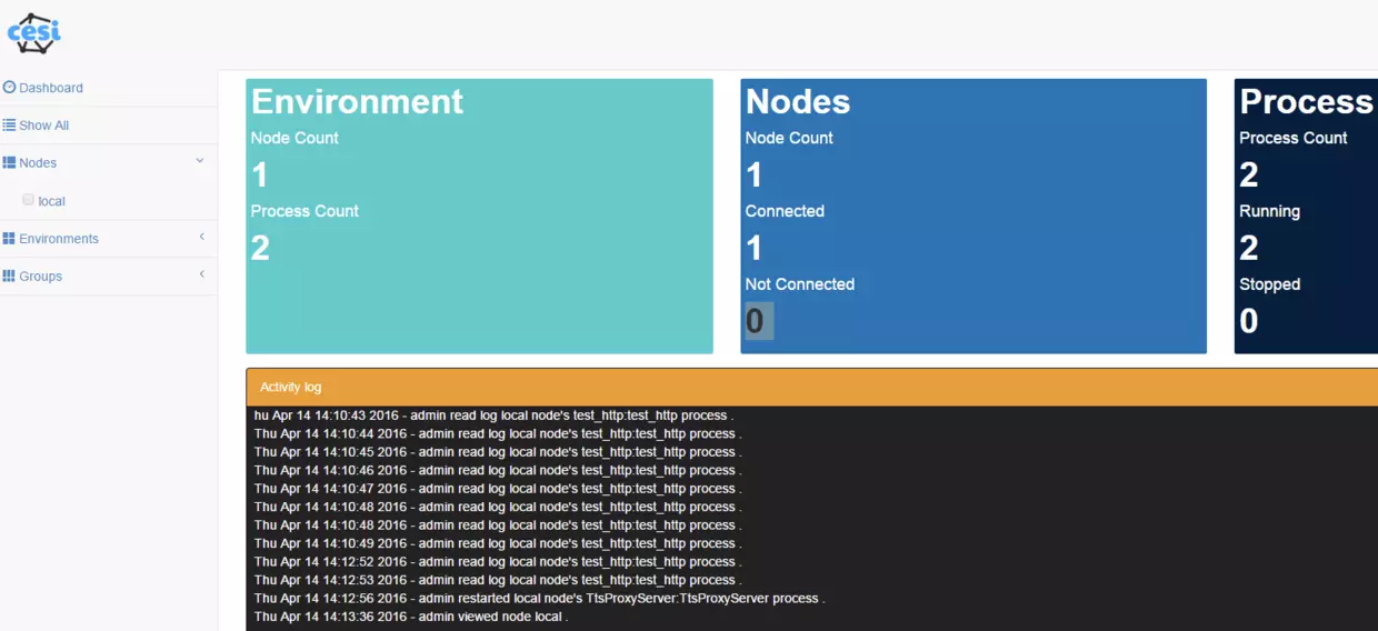 [node:local] ### 设置监控的各个机器 username = user password = 123 host = 192.168.14.8 port = 9001 ;[node:<node_name2>] ### 如果有多台机器,就依次添加 ;username = <username> ;password = <password> ;host = <hostname> ;port = <port> ;[environment:<environment_name>] ;members = <node_name>, <node_name2> [cesi] database = /root/temp/cesi/userinfo.db ### 设置db路径 activity_log = /root/temp/cesi/cesi.log ### 设置log路径 host = 0.0.0.0