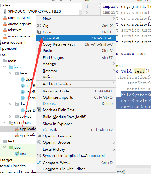 FileSystemXmlApplicationContext app = new FileSystemXmlApplicationContext("D:\\Java_SE\\java\\java_ioc56\\src\\main\\resources\\applicationContext.xml"); userService2 service2 = app.getBean(userService2.class); service2.save();