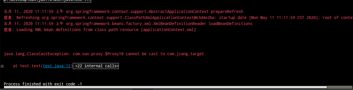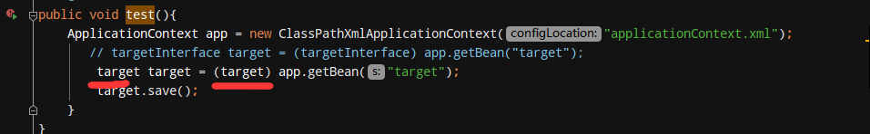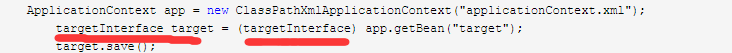 import com.jiang.target; import com.jiang.targetInterface; import org.junit.Test; import org.springframework.context.ApplicationContext; import org.springframework.context.support.ClassPathXmlApplicationContext; public class test { @Test public void test(){ ApplicationContext app = new ClassPathXmlApplicationContext("applicationContext.xml"); targetInterface target = (targetInterface) app.getBean("target"); target.save(); } }