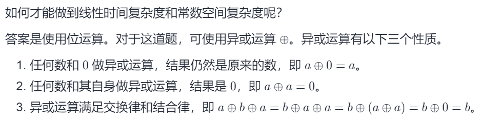 不开辟新的空间,一般暗示用位运算或者异或解题